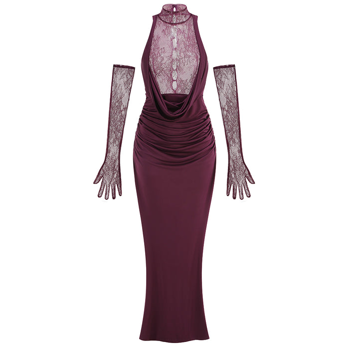 Flower Halter Draped Bridal Maxi Dress in Burgundy