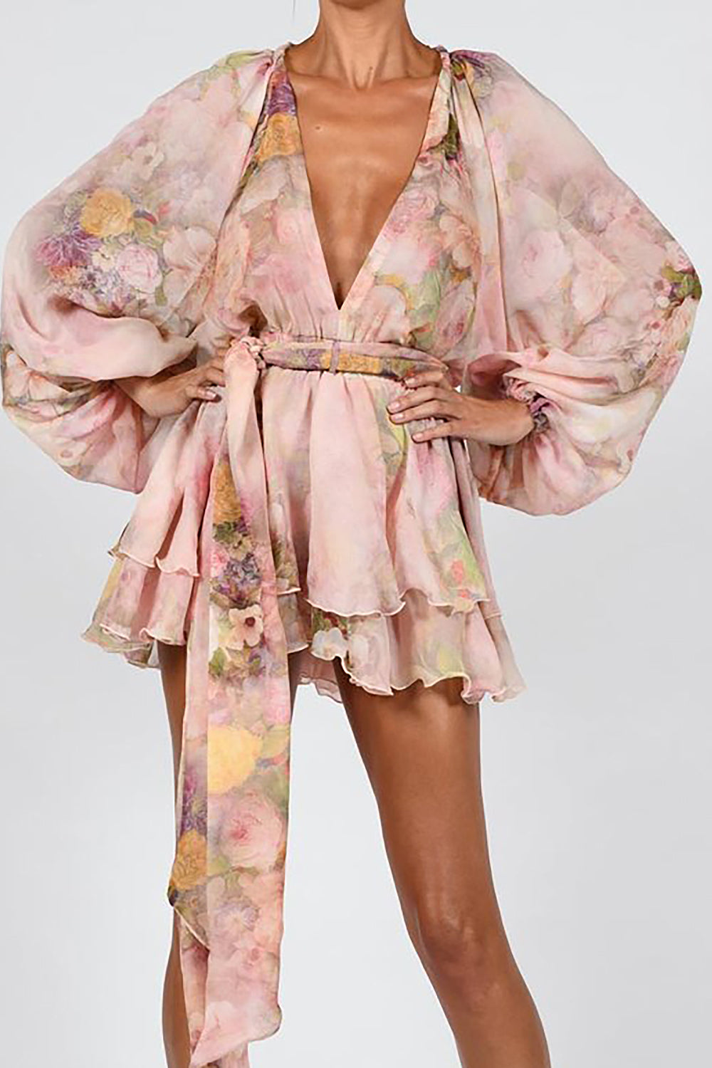 Flowers Printed V-neck Mini Dress