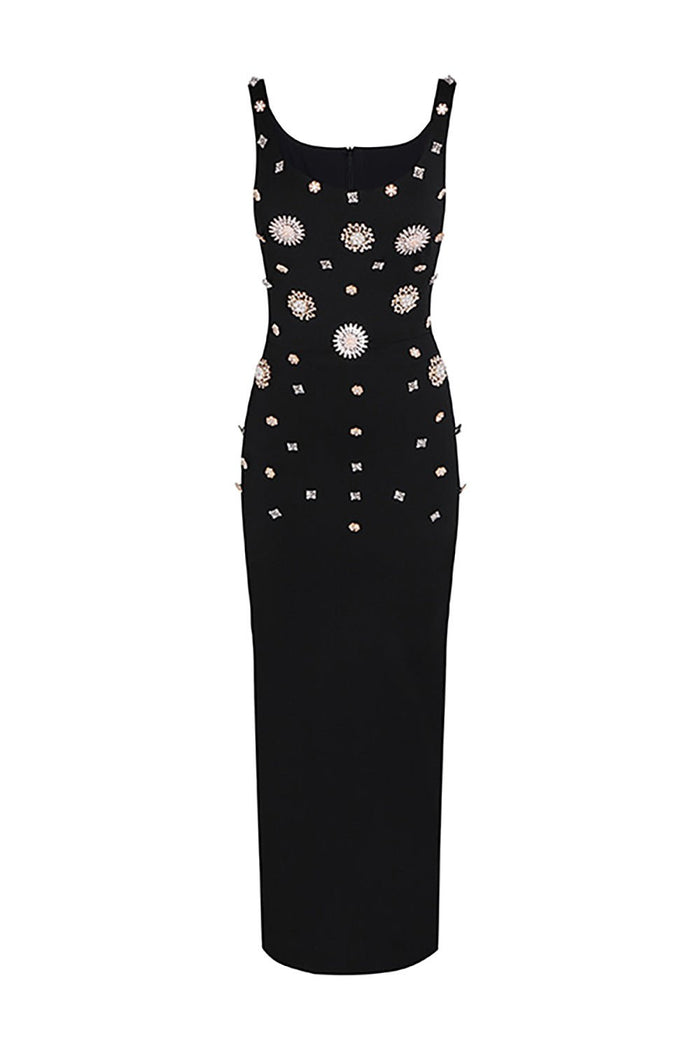Vestido largo con vendaje de cristales y flores negras