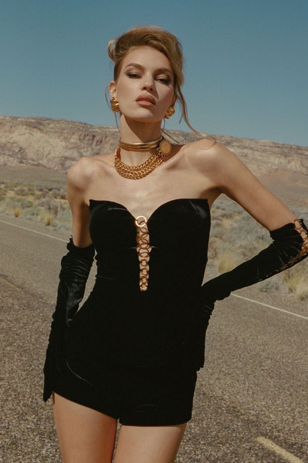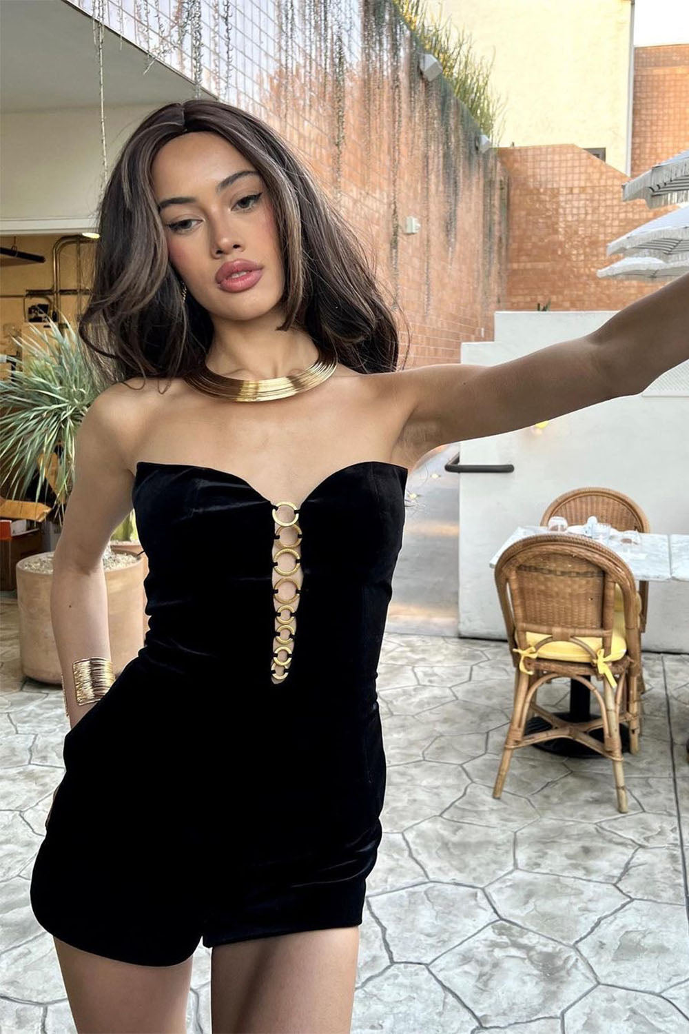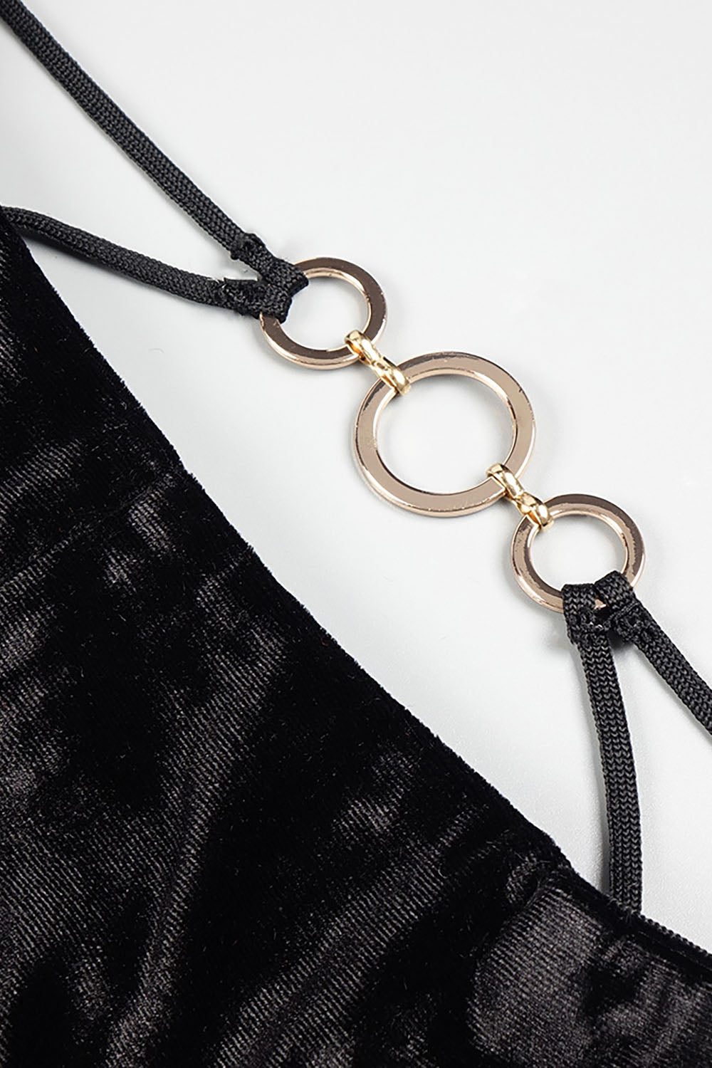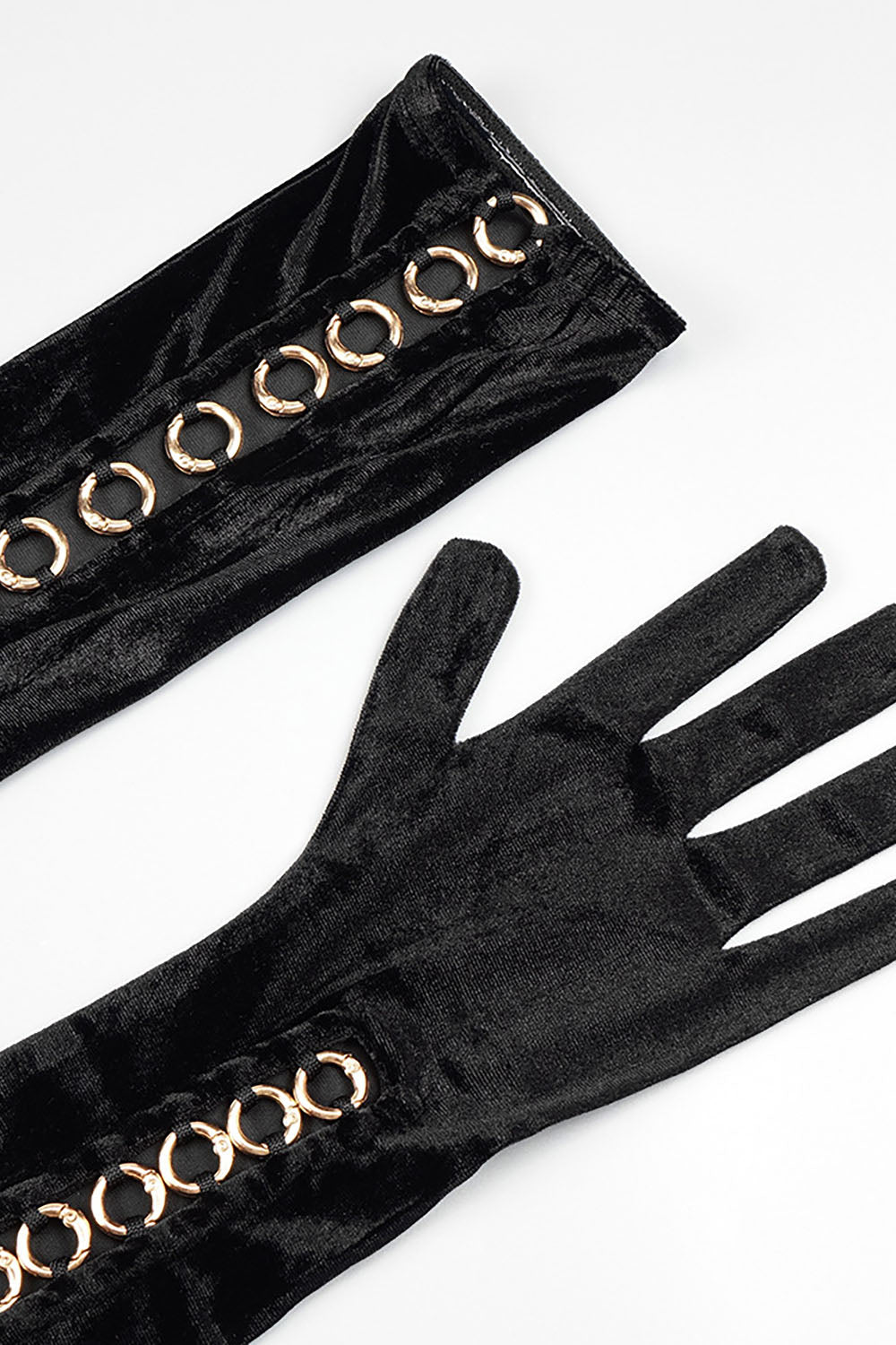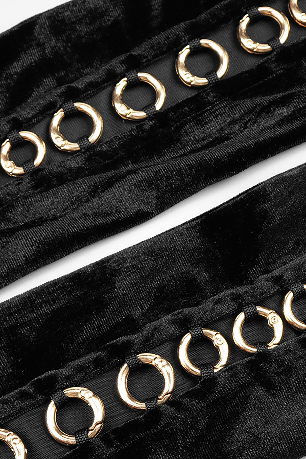 Indulge yourself in the chicly-embellished elegance of this velvet ring set that includes a tube top, shorts, and gloves. Crafted from lush velvet, this premium two-piece set is sure to make a luxurious statement.