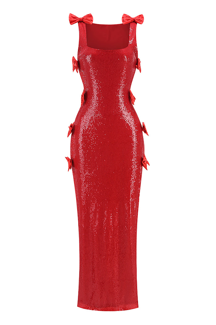 Vestido comprido com laço e lantejoulas nas costas