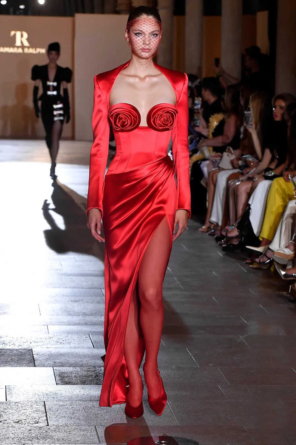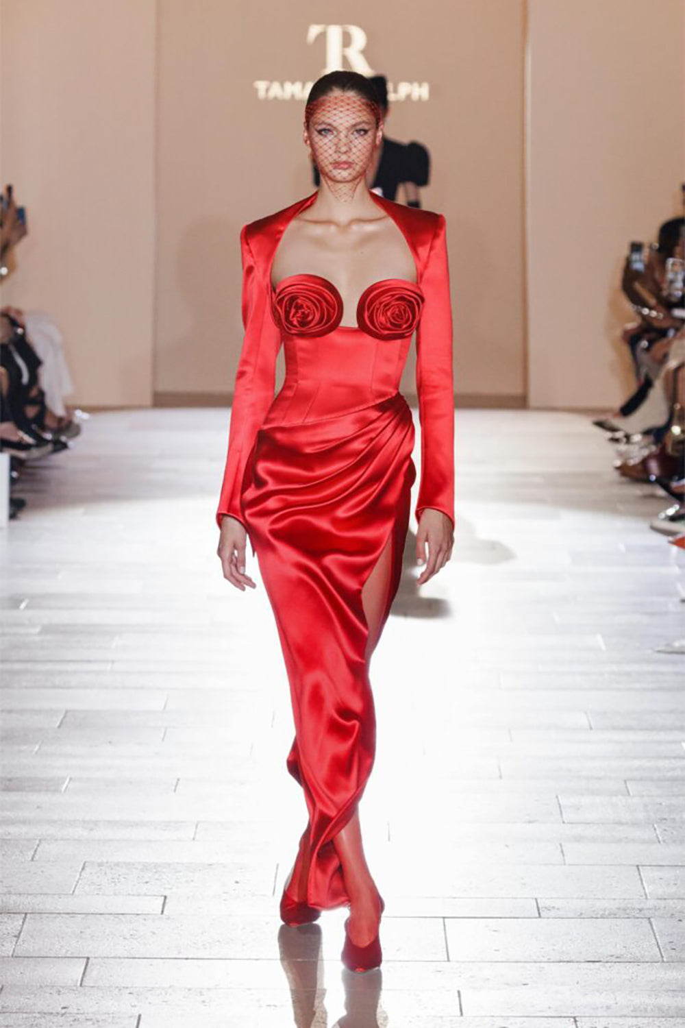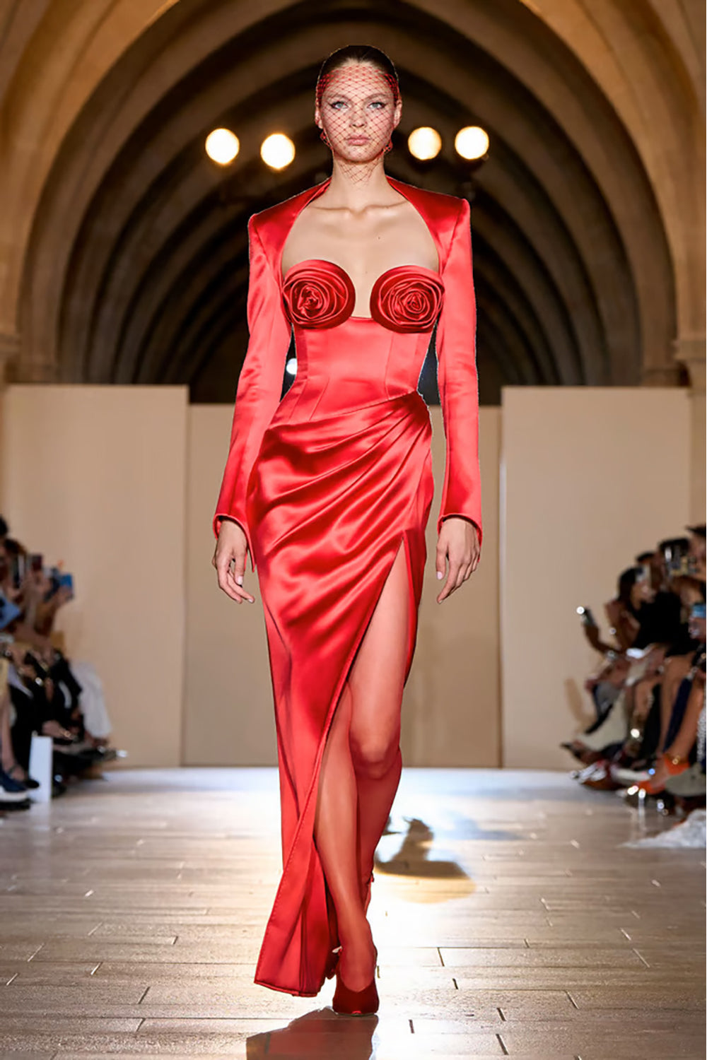 - Floor-sweeping hemline